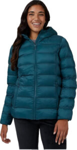 Lightweight, packable, water resistant and cozy warm with a hood to keep you comfortable. Perfect layering piece for Alaska days.